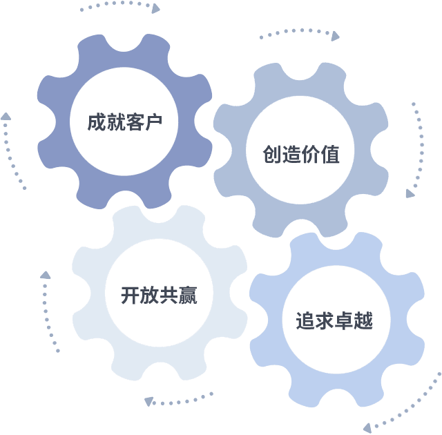 成就客户是一切决策的出发点,,,创造价值是衡量所有工作的标准,,,,追求卓越是我们做事做人的态度,,开放共赢是我们的格局也是最终的结果。。。价值观的齿轮环环相扣,,推动着组织里的每个人不断向前。。。